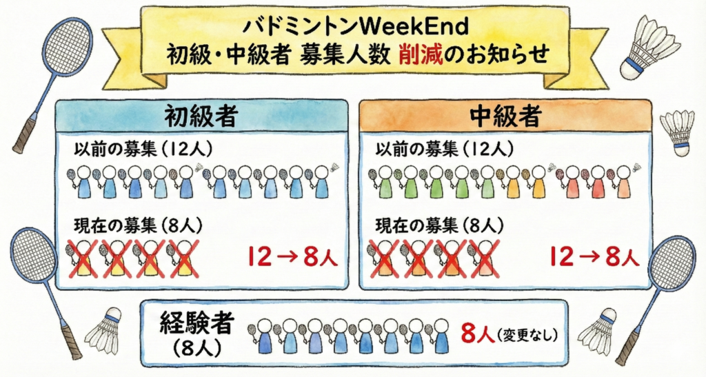 人数制限をする理由は中級者はかなりレベルが高くなってきており、それに伴い体力がついてきた人が多い事、それにより中級者と初級者のレベル差が大きくなってきたこと、また親が連れてきている小学生の子供達にも初級者のコートを使ってバドミントンの試合に参加させたいためです。これまで初中級者は体力がなく休憩時間も長い事が多かったため、12名の募集としていましたが、少なくとも中級者は体力・レベルが上がっているため、もし本当に9名以上集まってしまい待ち時間が長くなってしまうと物足りないと感じる可能性が高いため、新年からは8名までの募集とする事としました。また初級者についてはまだまだ体力が無い人が多いため12名のままでも良いのですが、小学生の子供達が試合をする枠を作るために、初級者の募集人数を8人までに制限し、残りの4人の枠で小学生が試合を出来るようにする事が主な目的です。