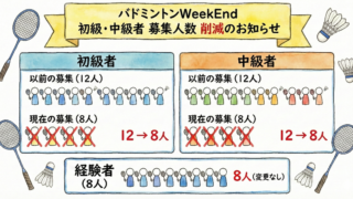 考えています。とはいえ、人数制限を撤廃してもそんなに急に経験者側も参加者が増える事は無いと思いますので、暫くは初心者側も主コートを使えると思いますし、経験者が12人以下の場合は2試合に1試合は主コートを使えますので安心してください。